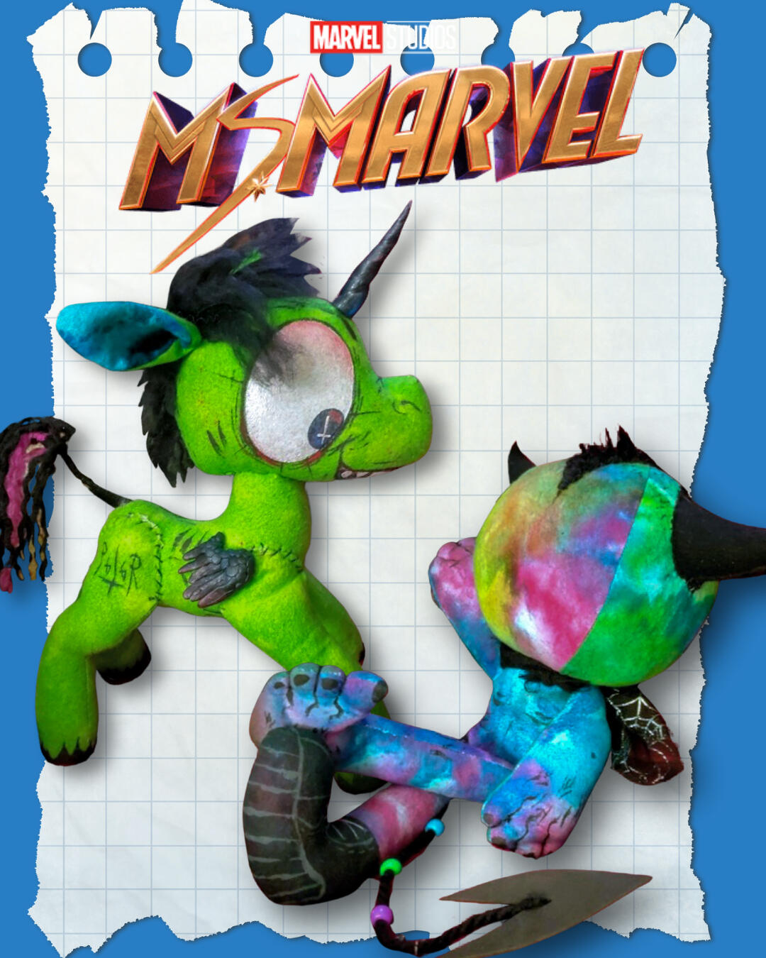 In 2021, I met production designer Christopher Glass while vending my art at an event in Atlanta, GA. Once we got in touch, he informed me that he would be working on the new Disney+ TV show, Ms. Marvel.The show Ms. Marvel is about a quirky teenage girl named Kamala Khan who idolizes superheros, particularly Captain Marvel."Pakistani-American Super Hero Kamala Khan protects the streets of Jersey City with her one-of-a-kind embiggening power."Christopher must have thought my dolls suited her creative and oddball energy perfectly, because he helped me sell two of my dolls Rainbow Demon and Green Unicorn to be featured in the background of Kamala's bedroom set.