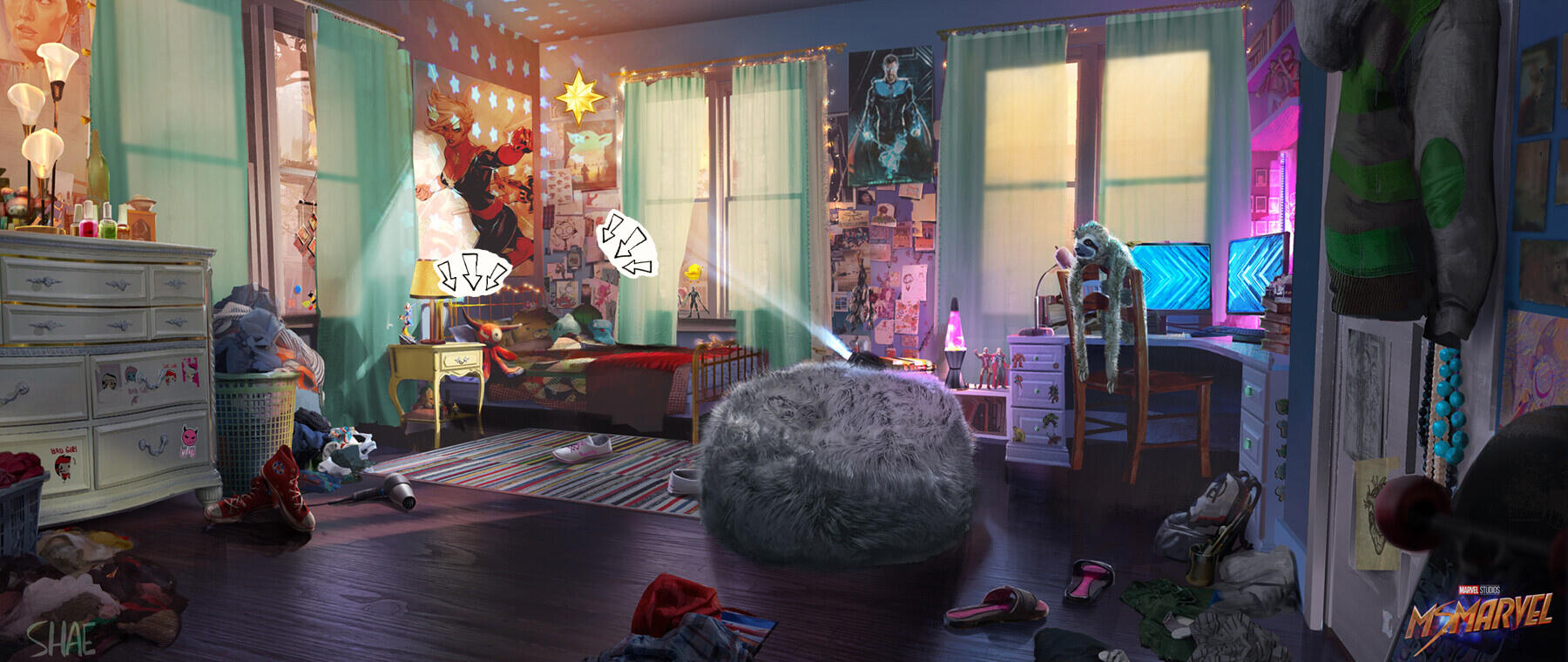 During the production of the show, concept artist Shae Shatz photoshopped images of my art from Instagram into the concept art of Kamala Khan's bedroom set.